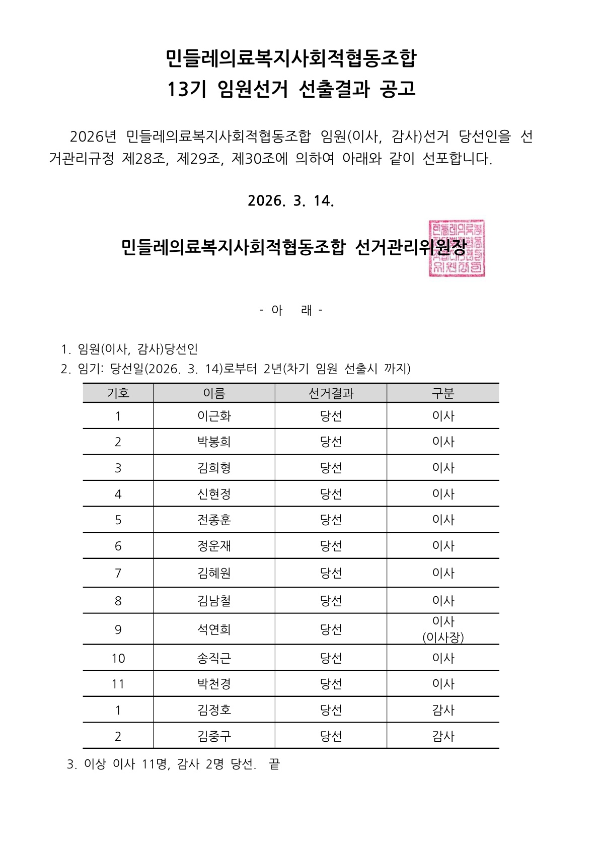 2026년 13기 임원(이사, 감사)선거 당선인 공고